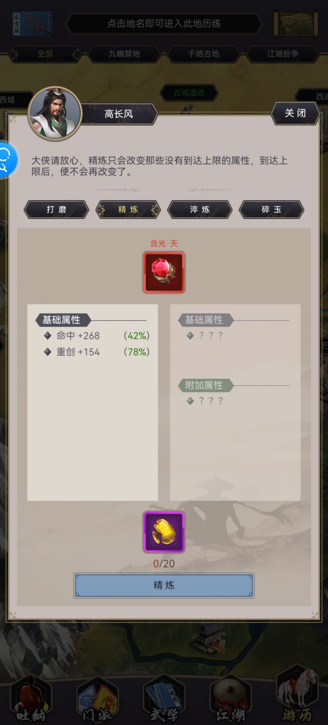 对于萌新的建议:先从古城买一个紫色火玉过渡,其他四个用七星掉落的(注意筛选)。到达百花后,逐步替换镖局的天阙火,木(注意别弄错,镖局有另外两套凑数的)。关于天池,不要去追求单体最高的重创火玉(含光火),这样也能减轻天池的压力。天池有多的龟背可以考虑千机水和千机土,这两个是不矛盾的,毕业玉必有这两个。