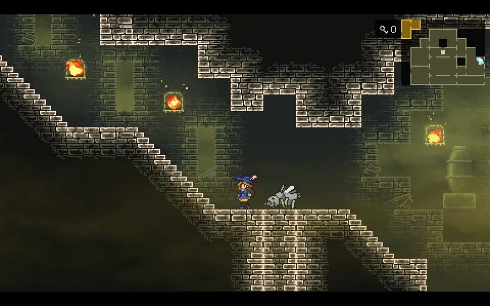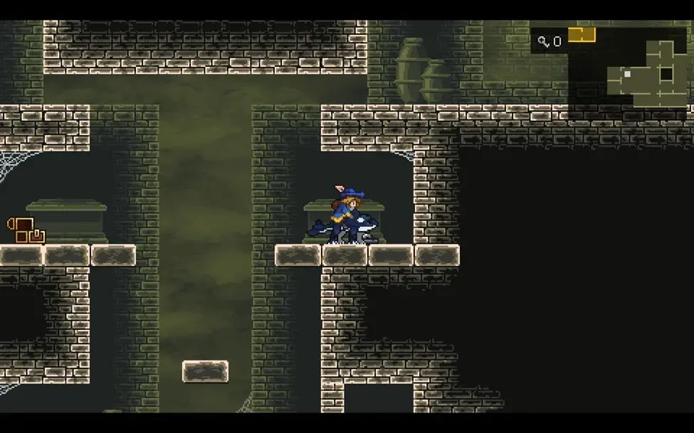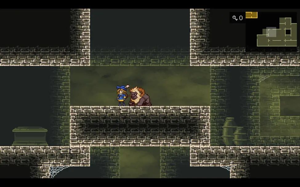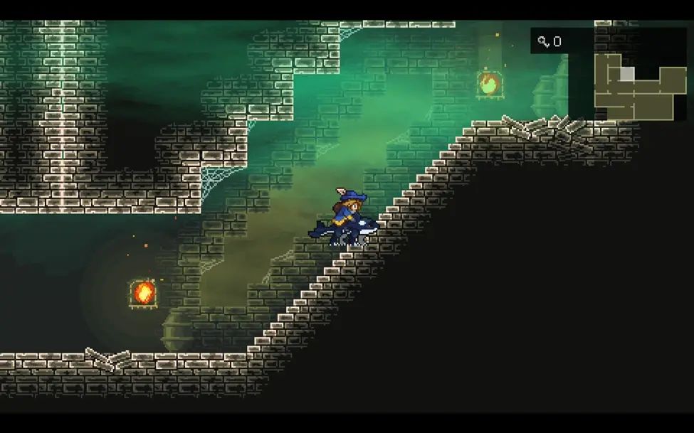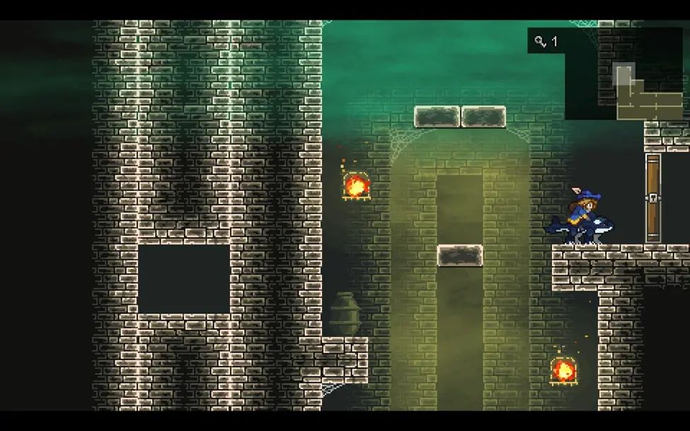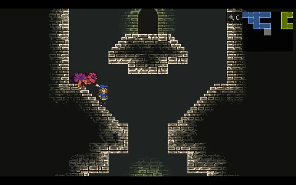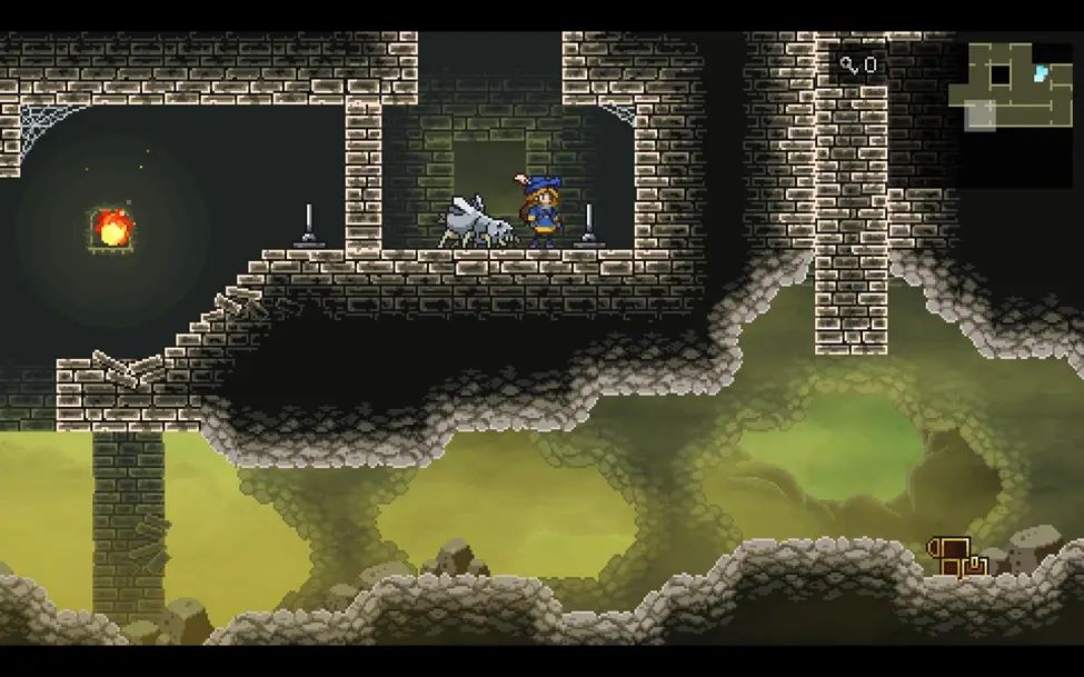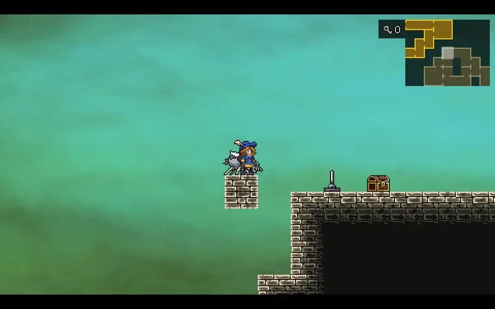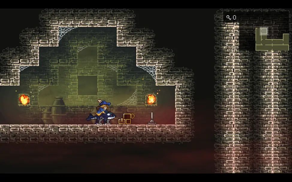 沿路从右边绕到图中的房间,这里右侧的机关是打开往下的捷径的,左侧的机关是用来控制左侧石柱的位置的,不去收集物品的话往下移动一次就行。