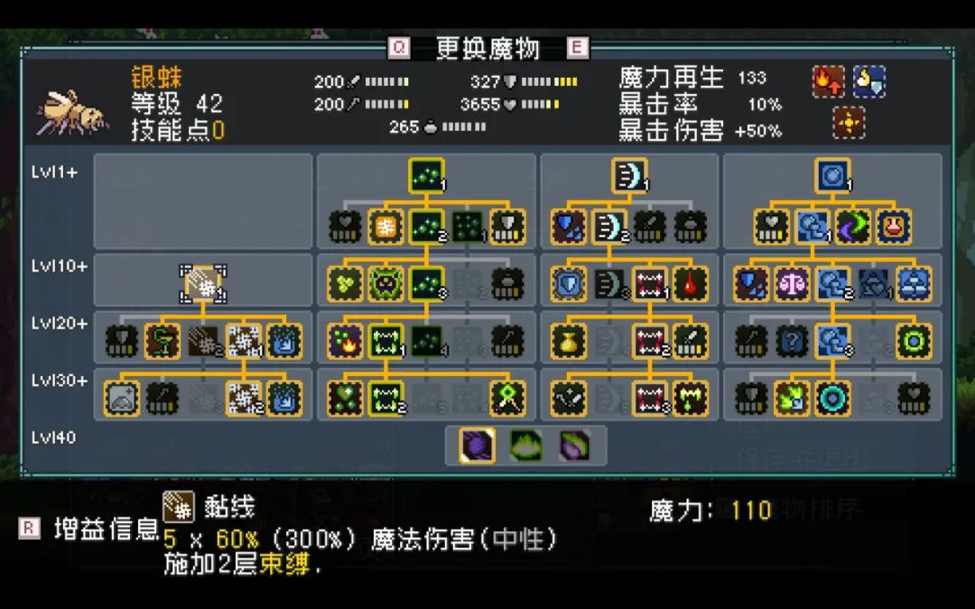 银蛛核心词条:debuff,buff单挑王,打人可以回血上debuff清除buff获得充能+buff,自身输出也有耐久也有,但很可惜的是怪物圣所玩的还是一个队伍搭配,而银蛛这玩意,虽然自己体系挺全的,但和其他魔物间并没有什么搭配,而且啥都会的后果就是啥都不精通,理论上这玩意可以塞到任何一个队伍中,但实际上各个队伍想要的都是一些更加特化,和队伍有更好配合的魔物,而不是一个单挑王。