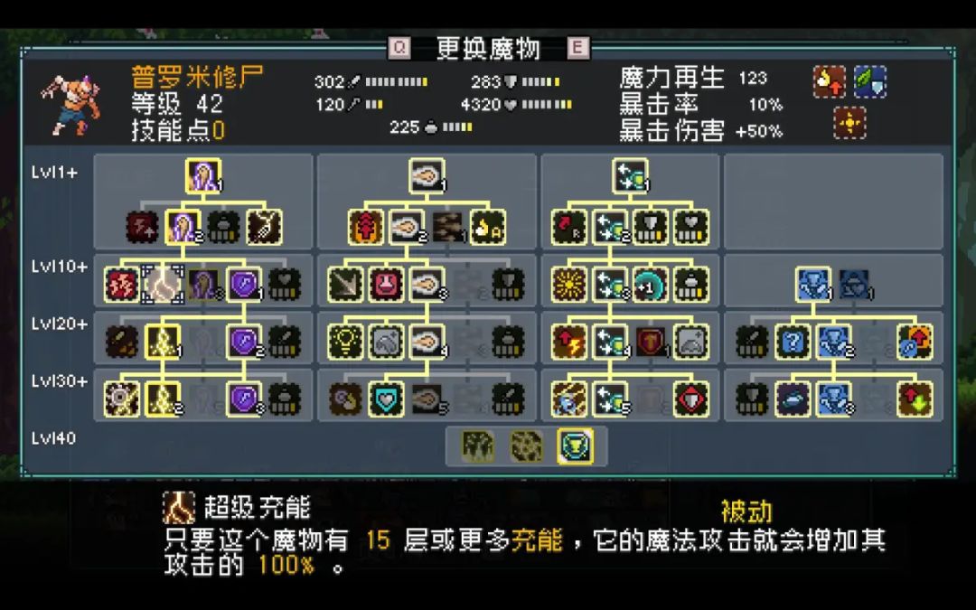 普罗米修尸核心词条:电击,充能,buff,护盾堪比来悲茶的灵魂翻译。意外好用的一只魔物,以一个辅助手来说,有着保护能够强行转移伤害,有专注防御+专注生命坦度很高,有全面进攻加buff,光转更是提供了额外的buff上限,自身挨打和行动都能上电击,关键还有一手充能再生,这玩意相当于有两条命,同时普罗米修尸,即便是偏辅助的配置也能在关键时刻打出可观的伤害,自身另一个核心被动叫超级充能,在15层或者以上的充能时能让魔法攻击提高攻击的100%,配合自身雷霆一击的高倍率,即便是辅助向叠生命防御的普罗米修尸也能在充能叠起来后打出可观的伤害,更不要提暗转走输出路线的普罗米修尸,配合上有充能放大器的队友,是可以作为电击队主C的存在。精英魔物