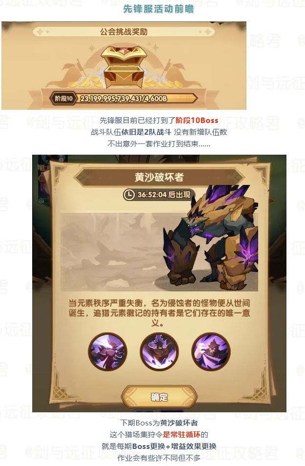 3.每期的首领会进行轮替,并且每期会随机一个特征。上阵符合该特征的英雄越多,可激活的增益越强。