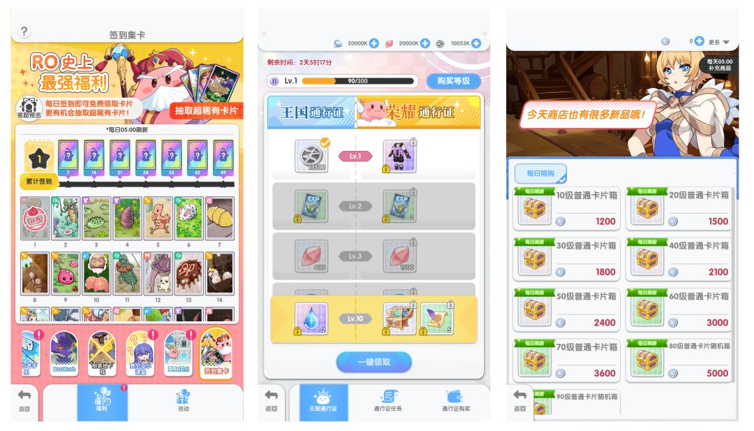 累计签到、王国通行证、星途豪礼、卡片商人、各种限时活动、恩德勒斯塔等等方式。