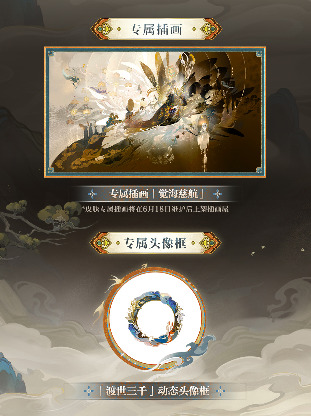 △#禅心云外镜典藏皮肤#「渡世三千」将于6月18日维护后上架皮肤商店,售价148魂玉,上架首周限时折扣118魂玉。