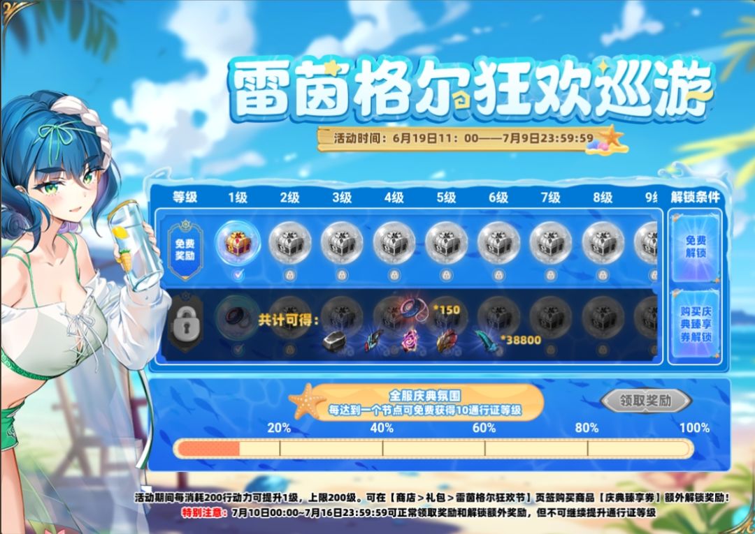 - 全服庆典氛围达到20%、40%、60%、80%、100%节点时可免费获得10通行证等级。