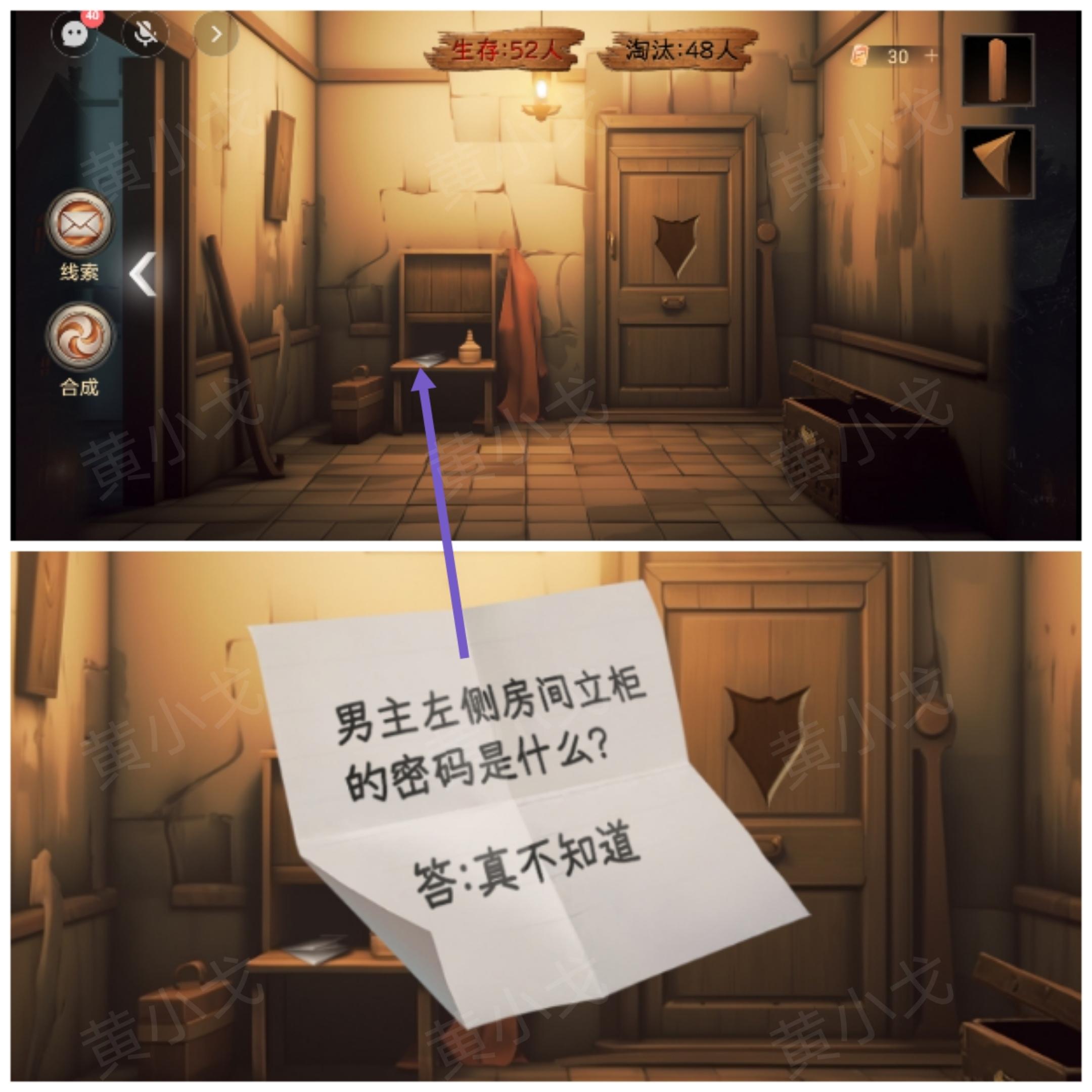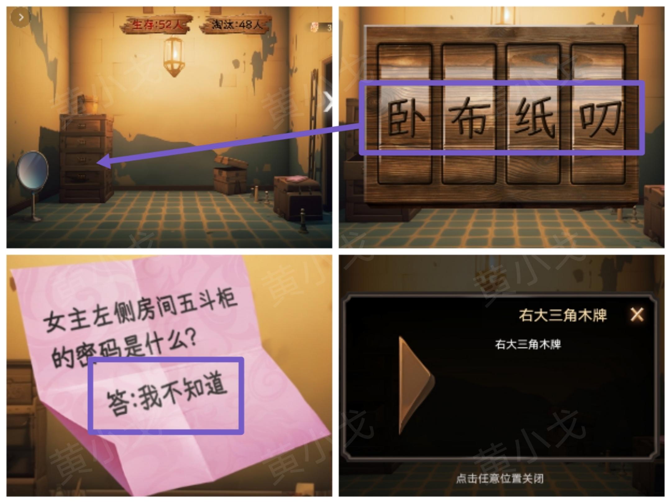 8.点击五斗柜上的密码锁,根据男主那边的线索,输入密码:卧布纸叨;打开柜子,获得【右大三角木牌】