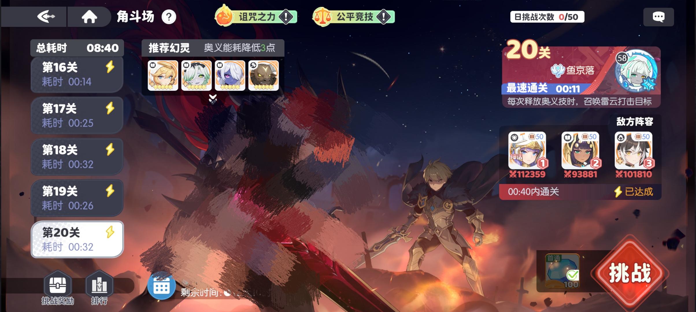首冲党第11天主线也是终于通关了。94w打到21-8,真的是太难了,前面好几关用的公会的佣兵,猫女现在越来越刮了,装备全给炎魔了导致猫女缺伤害,所以只能用公会的炎魔,然后猫女装的是炎魔的装备,21-8死活凹不过去,只好去抽点资源涨涨战力快100w,花了二十个号角,传承龙晶用了七十来个,战力一提伤害就不缺了,终于是打过去了,真不容易。决斗场就是让你搞加百列的,谁加百列星高谁过的就快,公平个牛魔,真逆天了,反正我是没那么多钻石去抽,大家看情况吧。今天就这样吧,害。