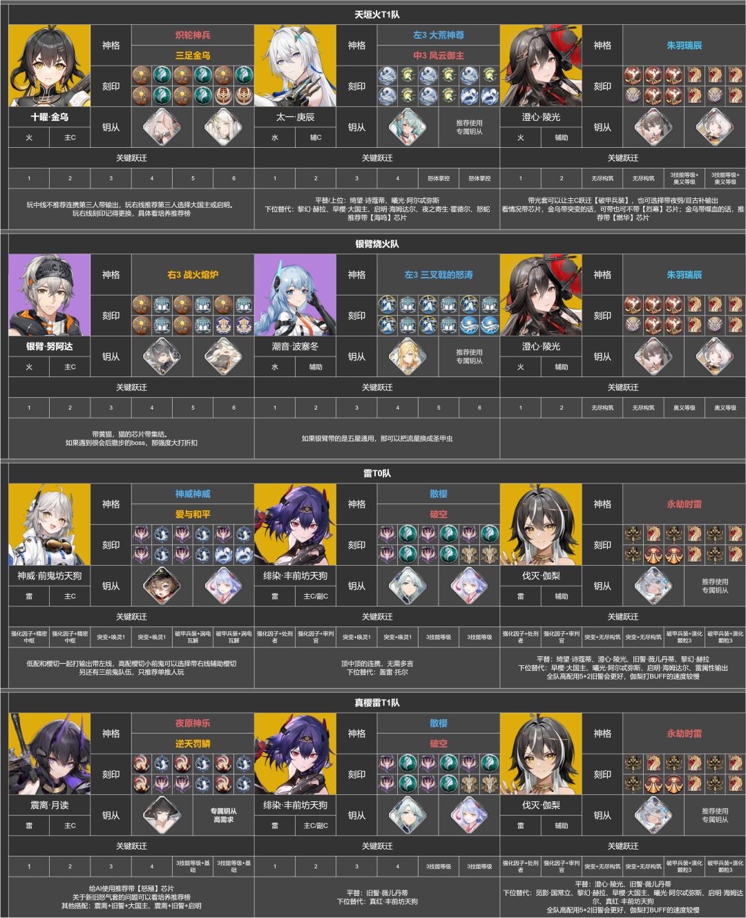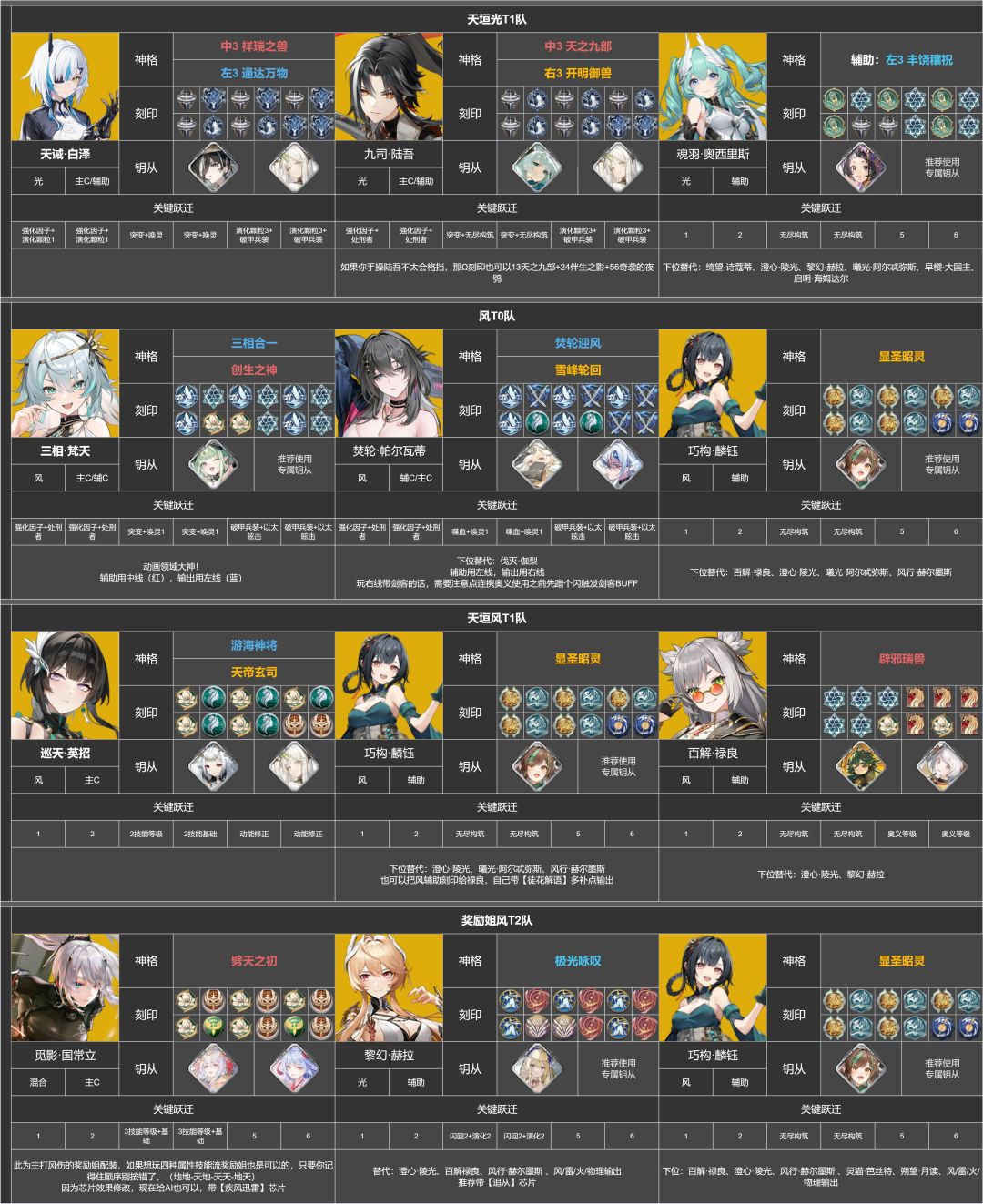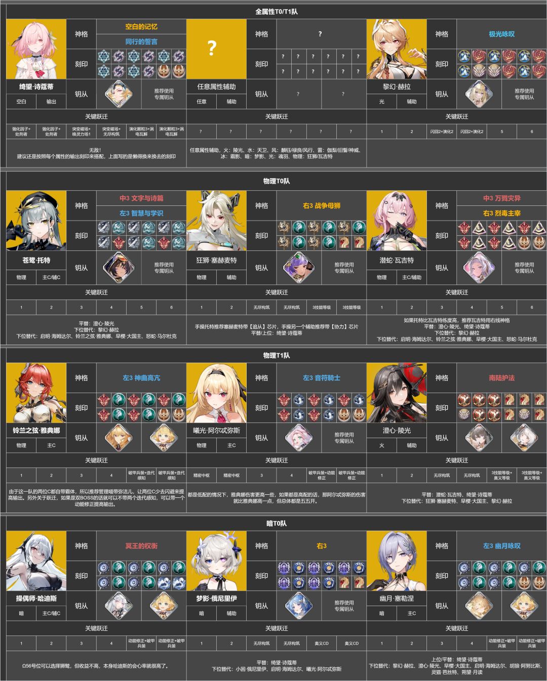 本推荐培养榜由花舞攻略组&深空之眼wiki管理员协会共同制作,内置浓缩角色攻略,附带上配队推荐表和跃迁推荐表,大家可以自行暂停查看,也可去评论区下载原图来查看。