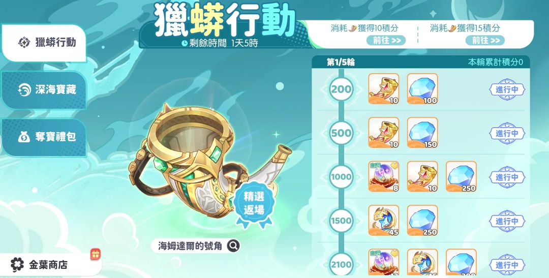 号角(神器):普通 10 积分 ;限定命运up 15 积分。