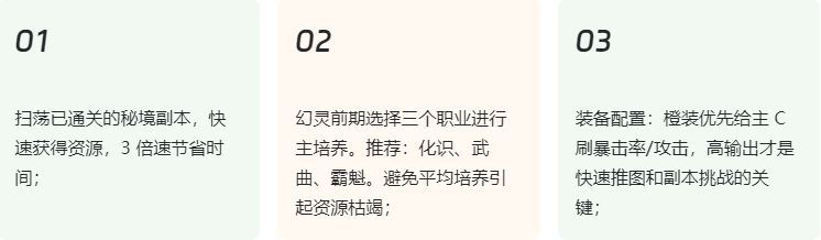 提前预约上线拿【史诗幻灵】→ 每日登录+收任务礼 → 幻灵配阵与养成 → 主线推进 → 资源规划!