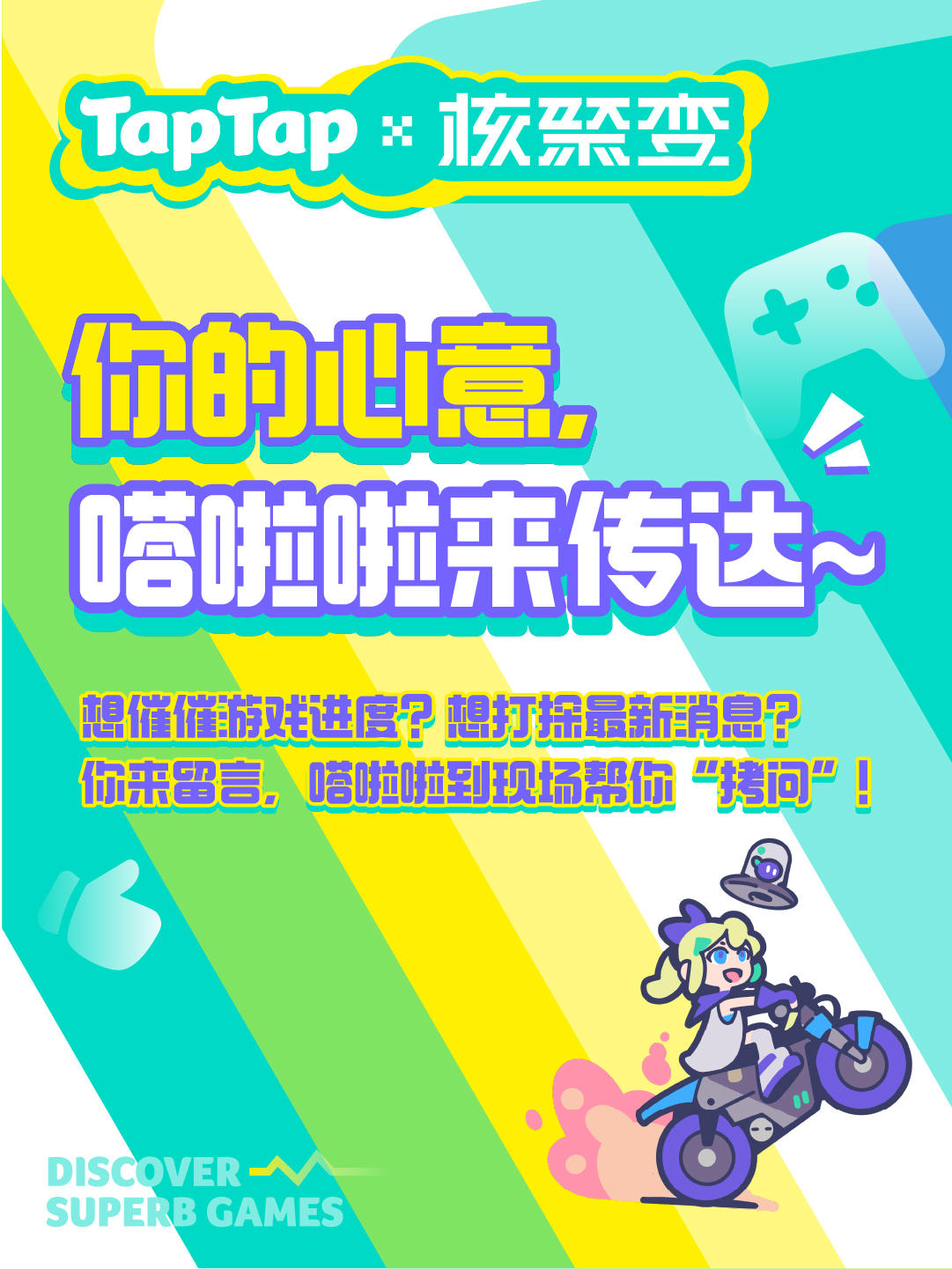 A:(,,´•ω•)ノ"(´っω•`。)摸摸头!你的心意,嗒啦啦来传达!想催催游戏进度?想打探最新消息?你来留言,嗒啦啦到现场帮你“拷问”开发者!