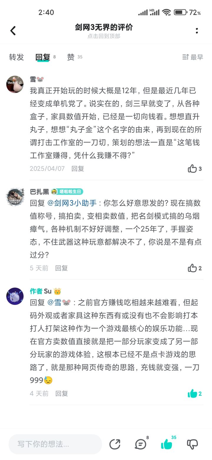 剑网三80年代之前的版本,一个赛季才出一套外观,最好看的外观一定是装备外观,而非商城外观,人家说剑三好,是那个年代好,就你们后面搞的一套套逼氪逼肝机制,我不知道有些玩家帮你们洗地是什么成分,但至少从那个年代玩到今天的,没一个不骂你们西山居的,那点情怀,那点好感,早被你们的逼肝逼氪榨干了