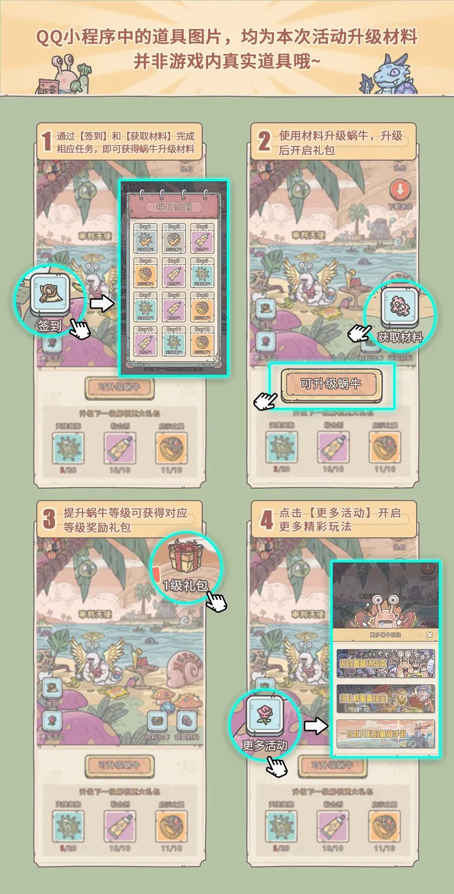 完成每日签到及任务,就可以获得升级材料升级蜗牛,获得相应等级的礼包奖励~