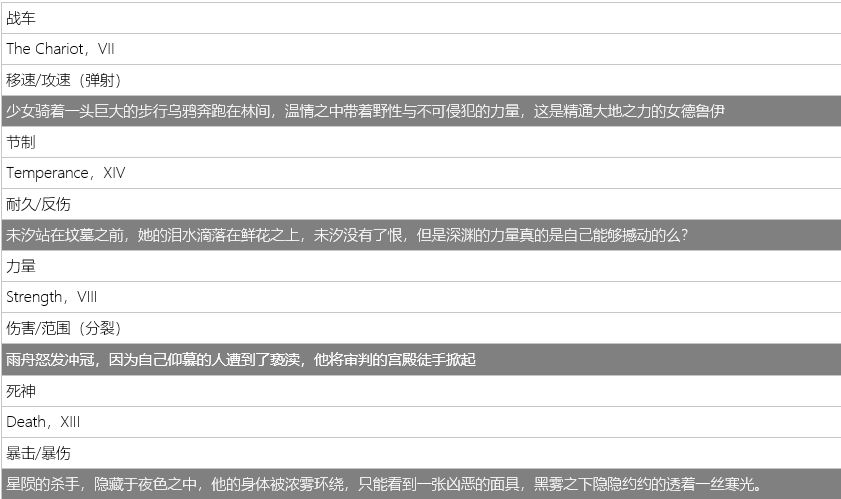 1.首先大家都知道,我们游戏的卡牌主要是以 剧情设定→套入塔罗牌→再套入游戏具体流派的方式构筑的