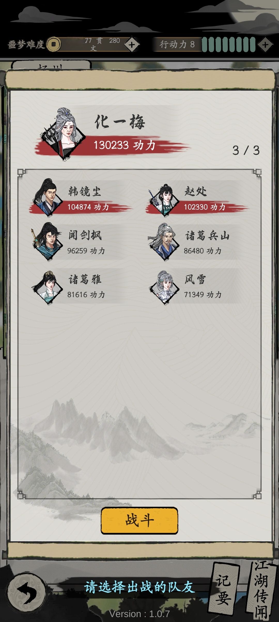 攻击:幽冥(2)+纯阳(2)+潇湘(3)[加成不是很高,但胜在无视防御,这里用10万战力加守的韩镜诚(张无忌)进行试验]