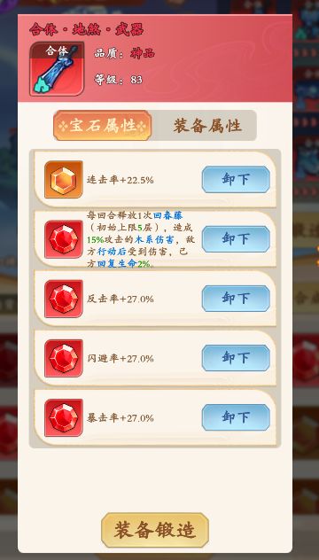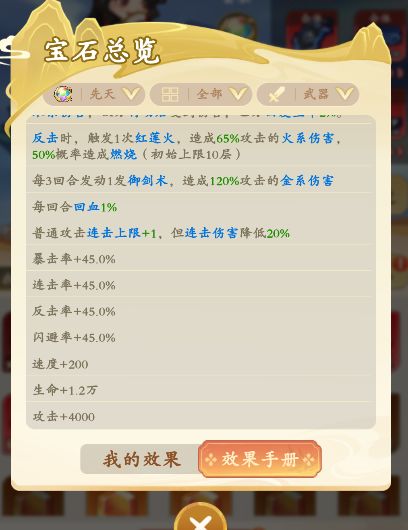 如果道友单纯为了增加战力,可以在武器、衣服、护符的宝石中优先选择增加闪避、连击、反击、暴击的宝石,在腰带、戒指、鞋子的宝石中优先选择抗闪避、抗连击、抗反击、抗暴击的宝石,则可以最大幅度的增加战力。