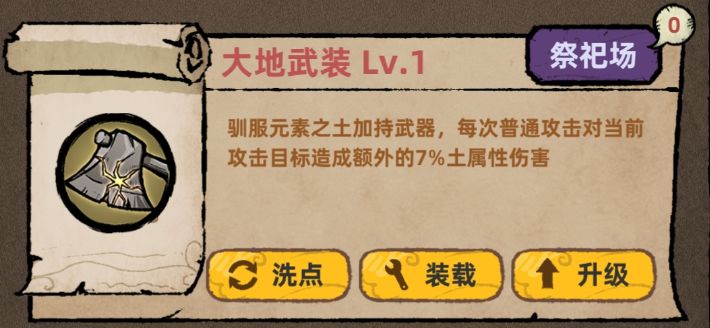 大地武装:每次普通攻击对当前攻击目标造成额外的7/10/13/16/19/22%土属性伤害。
