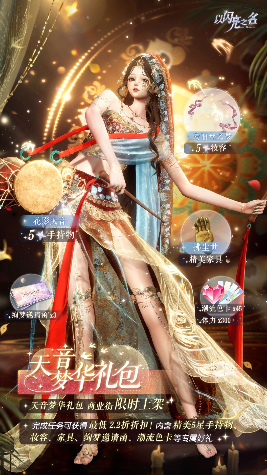 礼包售卖期间,合伙人可以完成限定任务获取礼包折扣。完成全部4个任务可降至最低折扣2.2折!超值优惠不容错过!礼包内含五星限定手持【花影天音】、五星妆容【爱丽丝之梦】、精美家具【拂尘世】、绚梦邀请函*3、体力*300和潮流色卡*45,该礼包永久限购1次。