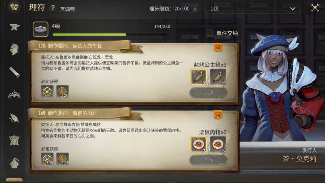 烹调师制作时所需的主要材料是食材和水产品。蔬菜和鱼分别由园艺工和捕鱼人采集而来,肉从敌人身上掉落。