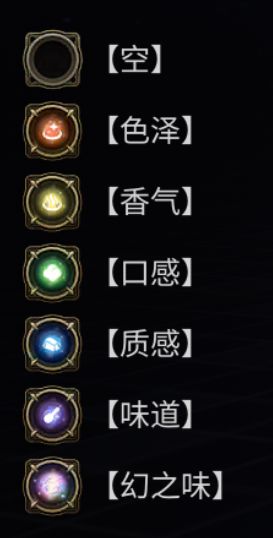 烹调元素一共有7种--【空】【色泽】【香气】【口感】【质感】【味道】【幻之味】,通过灵感获得3个一样的元素时,可获得【神技】。
