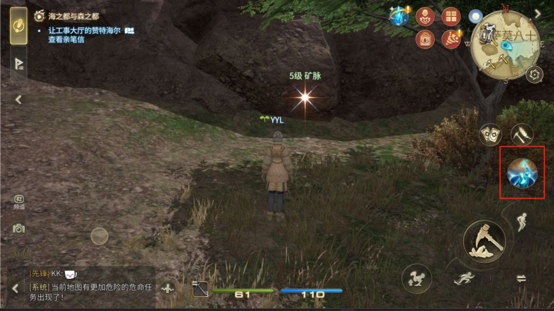 ▼靠近矿脉点击挖掘,在左上角点击目标素材后面的锄头即可开始挖掘