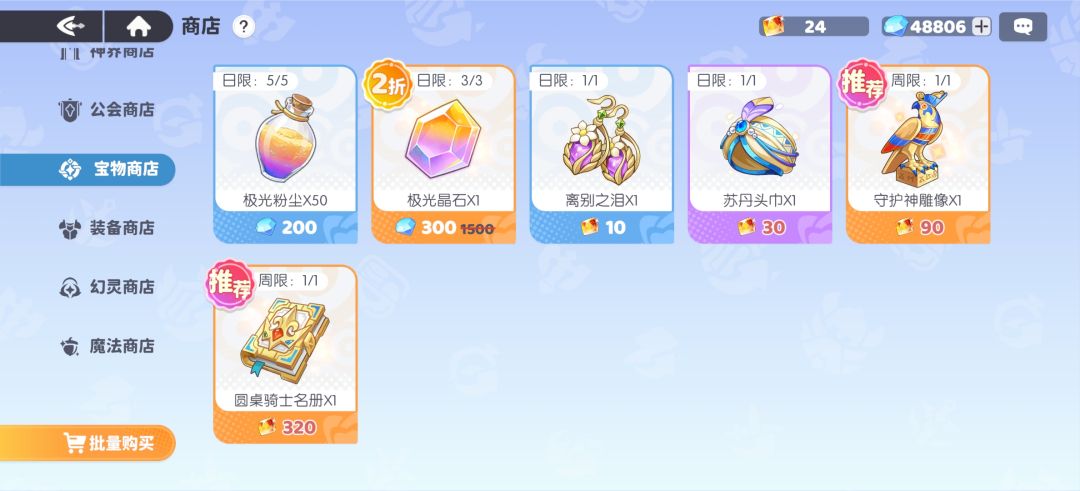 - 宝物根据自己的宝物精华数量和神器需求购买,例如:想要加快圣杯进阶速度,每周商店里有圣杯的宝物则购买,或者查漏补缺等。