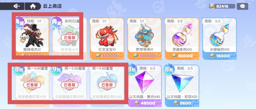 - 三种品质的曼德拉草推荐每周优先购买,每周需要买光,因为其来源很少需求大,每周买光曼德拉草后,剩余的云上花可以攒起来换典藏传说+魔物。