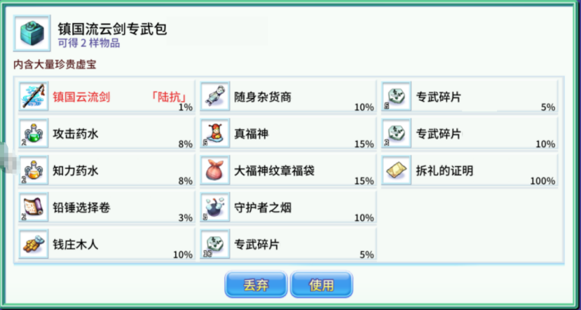 注:游戏内福袋类的随机概率均为服务器概率