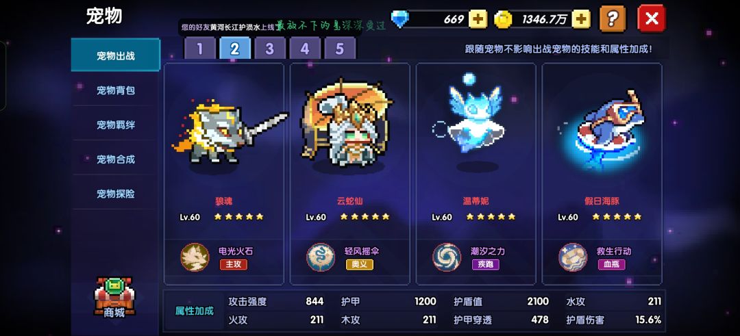 核心宠物:云蛇仙+假日海豚,无海豚可以使用鹿灵替代。