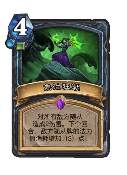 对所有敌方随从造成2点伤害。下个回合,敌方随从牌的法力值消耗增加(2)点。