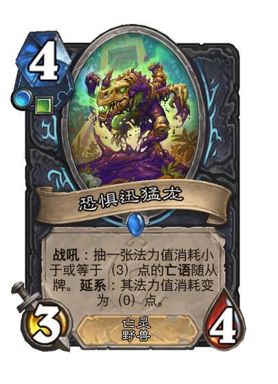 战吼:抽一张法力值消耗小于或等于(3)点的亡语随从牌。延系:其法力值消耗变为(0)点