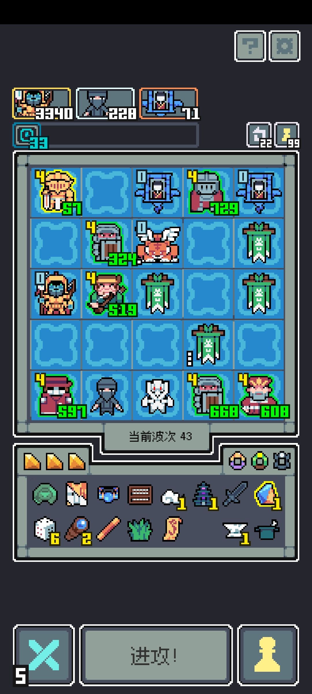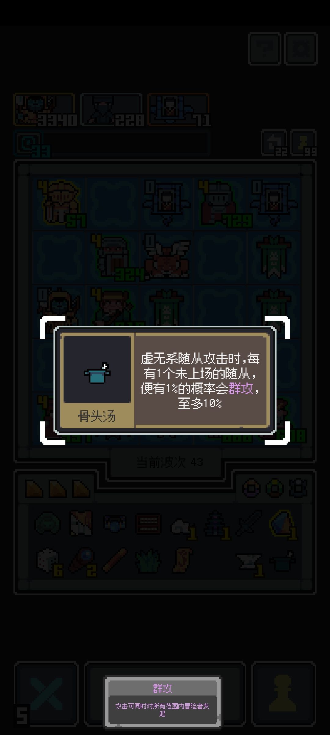 这套最大的问题是前期过度,不过其实问题不算大,前期铺海,凹出方天画戟和古墓将堆出一个100攻击古墓将的就可以直接开摆了。不过依旧有点坐牢,因为要刷百兽幡,所以藏宝箱这种优质发育组件拿不了,需要一定sl保障体验,而且回转到可以利用魔剑叠属性的时候也得是25波以后了,成型也是有点慢。而且由于骨头汤的群攻概率存在上限,所以这套上限也不算高,评价是各方面都被宝船等完爆