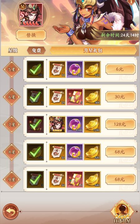 在升到9阶段(即太阳)之后可以获得比较大的提升,伤害提交或者辅助能力都会变得更加强力,建议大家在对于比较喜爱的武将先集中资源优先培养,游戏中有自选升星活动可以定向获得升星所需要的本体和材料,大家可以酌情购买