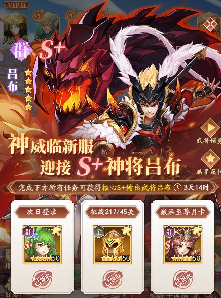 还有新服会有吕布降临获得,连续登录三天可以获得貂蝉和华佗和吕布,比较快的完成阵容的搭建,这样我们只需要搭配任一肉盾都能比较舒服的度过前期,当然如果抽到了其他武将而且比较多本体的话也可以先培养,也可以先培养S级的武将,最多升到8星就不要再升了,8星之后可以作为升级S+武将的材料,再升上去就不能再吃了