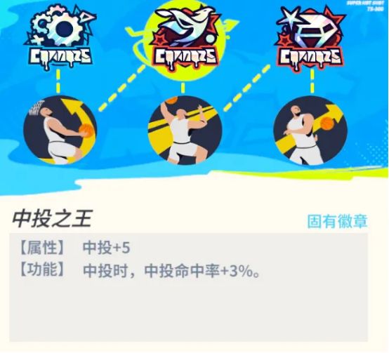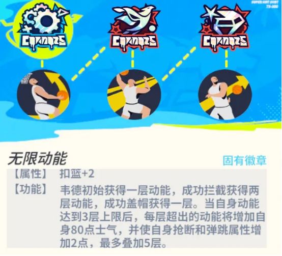 三徽章[高空杂技]功能的全部描述为:“韦德扣篮触发概率大幅提升,韦德所有花式扣篮动作都将视为释放【闪电暴扣】技能(可触发闪电暴扣的技能效果、受到闪电暴扣天赋加成,【飞身上篮】【击地突分】技能可衔接在花式扣篮动作中使用)。当动能达到3层时,使用基础扣篮必定出花式扣篮动作。”