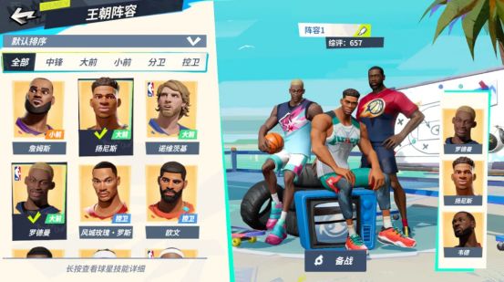 本套阵容重心区域在内线以及2分线,进攻回合三者都有强悍的扣篮属性和独特的得分方式,韦德的闪电突袭、扬尼斯的超远攻框、罗德曼的恐怖篮板为这个队伍提供了多样的进攻手段。而防守回合罗德曼的绝对篮下护框,和扬尼斯的遮天大帽,都会为韦德找到机会进行反击。