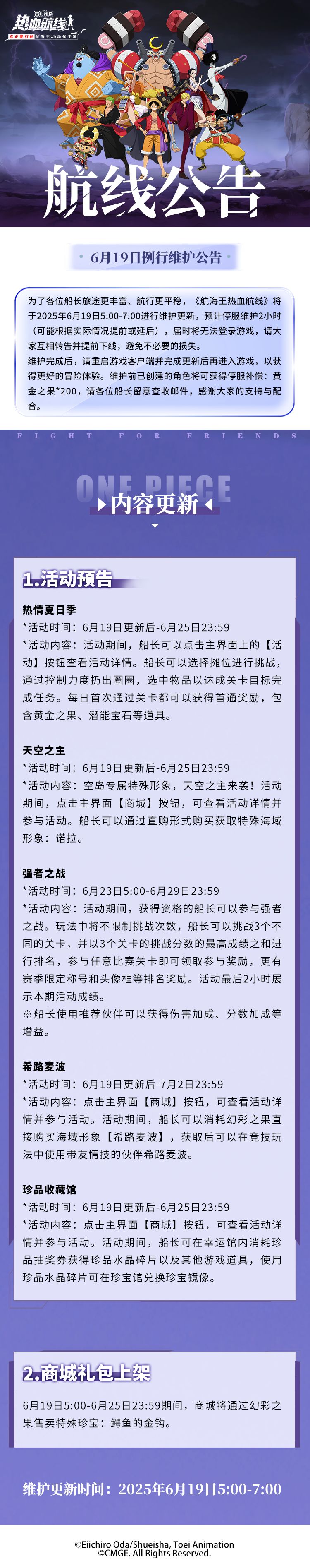 维护完成后,请重启游戏客户端并完成更新后再进入游戏,以获得更好的冒险体验。维护前已创建的角色将可获得停服补偿:黄金之果*200,请各位船长留意查收邮件,感谢大家的支持与配合。