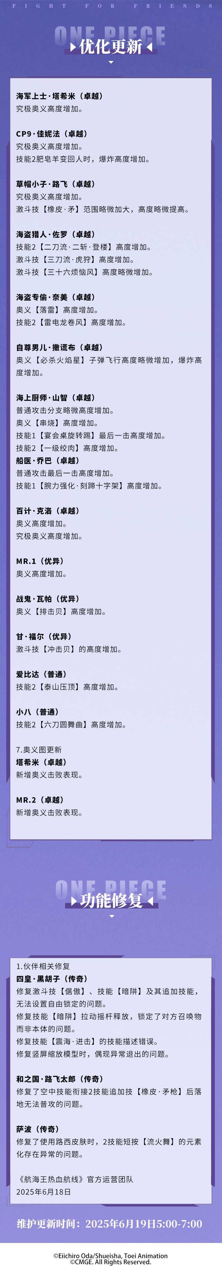 为了各位船长旅途更丰富、航行更平稳,《航海王热血航线》将于2025年6月19日5:00-7:00进行维护更新,预计停服维护2小时(可能根据实际情况提前或延后),届时将无法登录游戏,请大家互相转告并提前下线,避免不必要的损失。