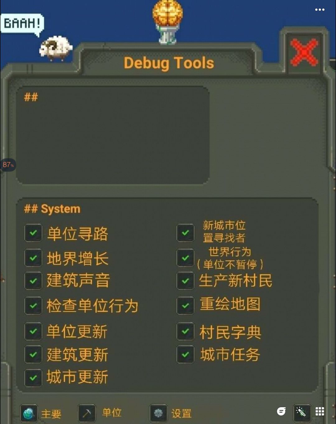 进入游戏,点击设置 ,再次点击设置,然后点击左上角的汉堡,点击次数11下,点击之后返回,屏幕右边就出现了一个虫子的图标,各位的是英文的,中文我已经帮大家翻译好了,有什么不懂可以问