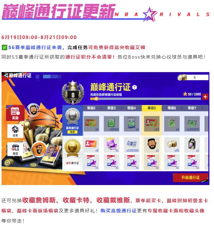 🔥「S6赛季:决胜巅峰」上线!🔥海量球员即将迎来数据更新!全新限时活动、全新现役球星卡池 完成巅峰通行证任务免费领全新收藏球员!更有专属收藏卡面和热门收藏球员等你获取!