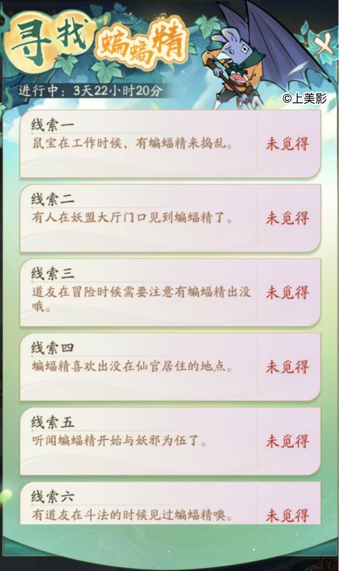 它们藏匿暗处,每日都有新的隐藏地点,道友快根据线索抓住捣乱的蝙蝠精!成功抓到蝙蝠精即可获得绘卷拼图及道具奖励。