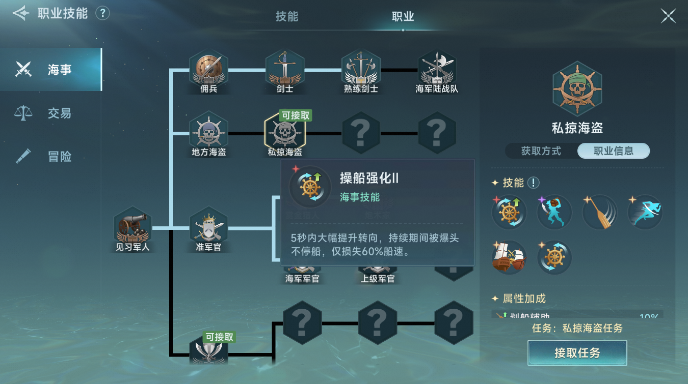 游戏中桨帆船基本的近战玩法,先要结合到游戏中的职业,职业选择:“佣兵”或者“海盗”都是近战输出相关的职业,区别在于佣兵的职业技能全是对于接弦后已经进入近战时生效;而海盗职业的技能会和船只相关,如何提高船只性能接近对手进入近战,比如图里私掠海盗职业的“操船强化“能大幅度提升船只的灵活性。