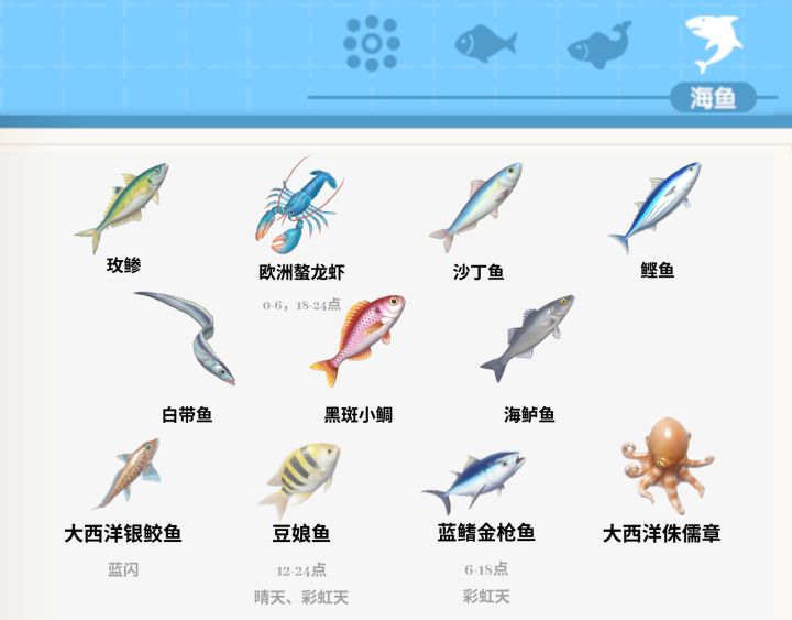 图鉴情报:获取途径“缓风海” 白带鱼/玫鲹/大西洋侏儒章/欧洲螯龙虾/黑斑小鲷 沙丁鱼/海鲈鱼/鲣鱼 9级:蓝鳍金枪鱼(6-18点,彩虹天) 11级:豆娘鱼(12-24点,晴天、彩虹天) 蓝闪:大西洋银鲛鱼