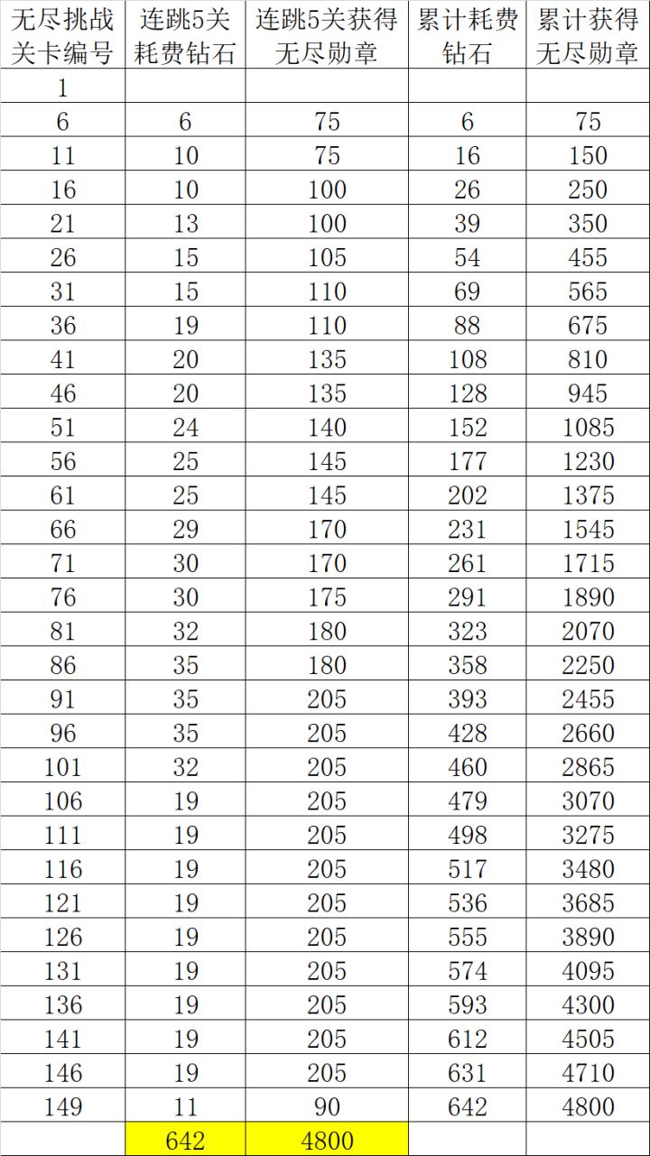 无尽挑战 149关跳关耗钻石和获勋章数据统计