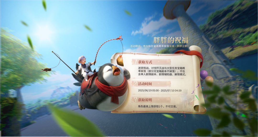 ●活动介绍:活动期间迷宫挑战、讨伐歼灭战与大型任务宝箱概率掉落【手游原创坐骑-胖胖企鹅】(部分无宝箱副本不掉落),不包含单人剧情副本、剧情辅助器、解限模式。