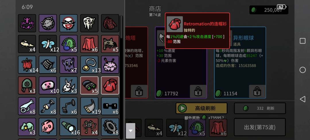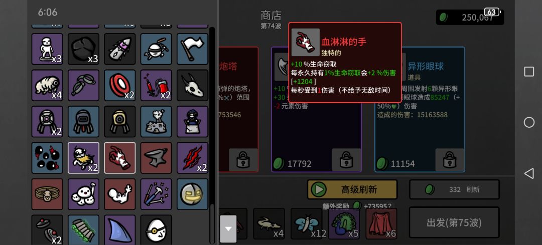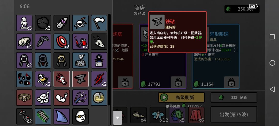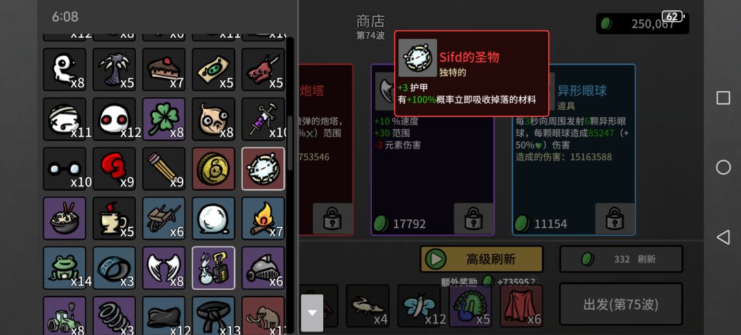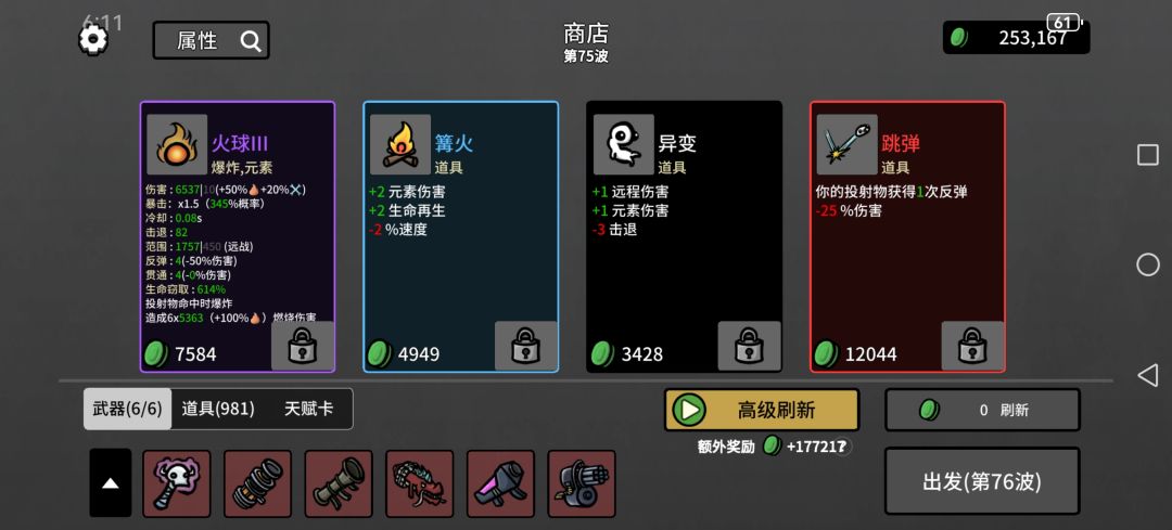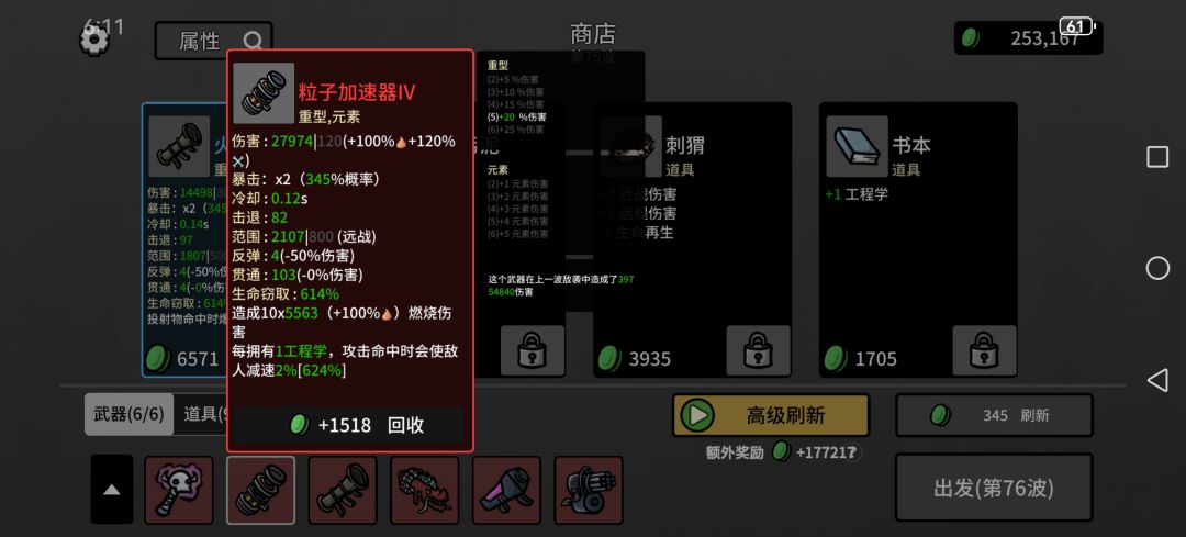 然后一些上限很离谱的,类似弹夹,每80材料加1最大生命值,看看广告材料就有了,血要多少有多少,反而护甲什么的叠不上去,可能还有未发现道具,已经无敌