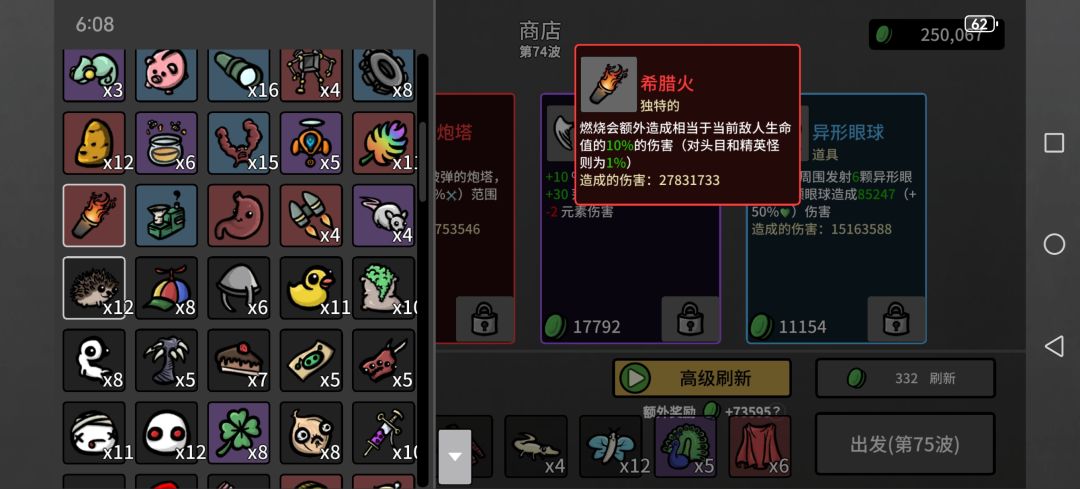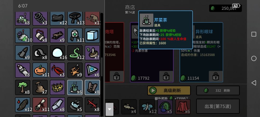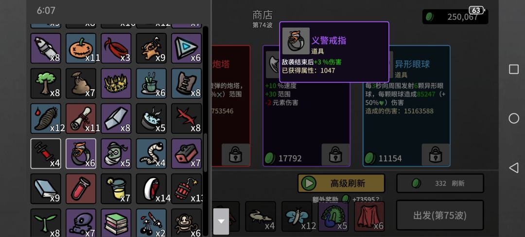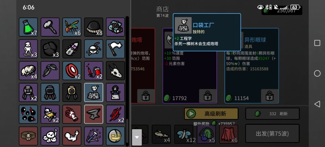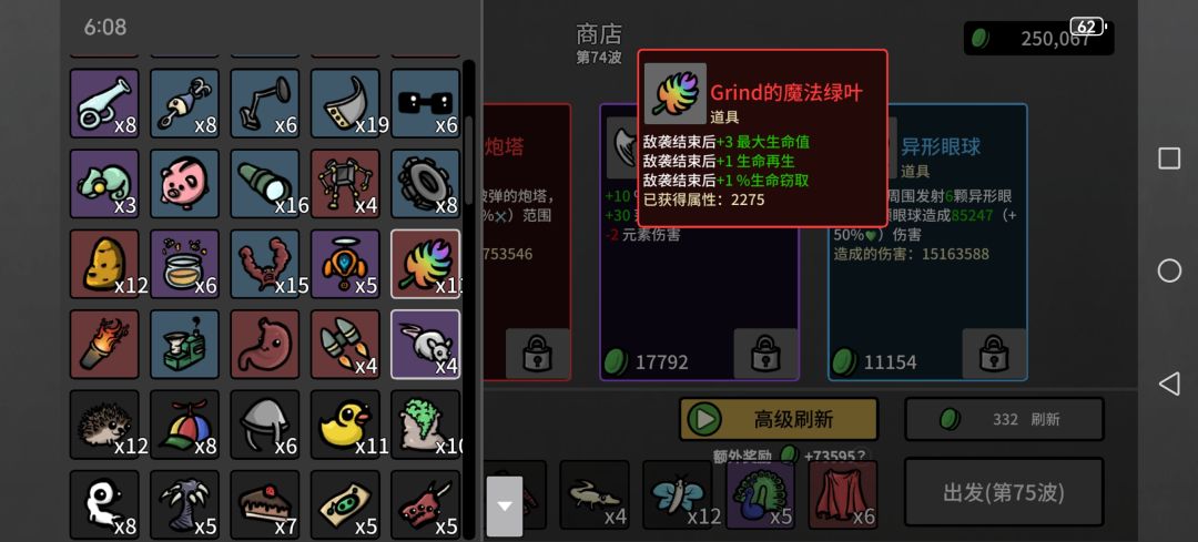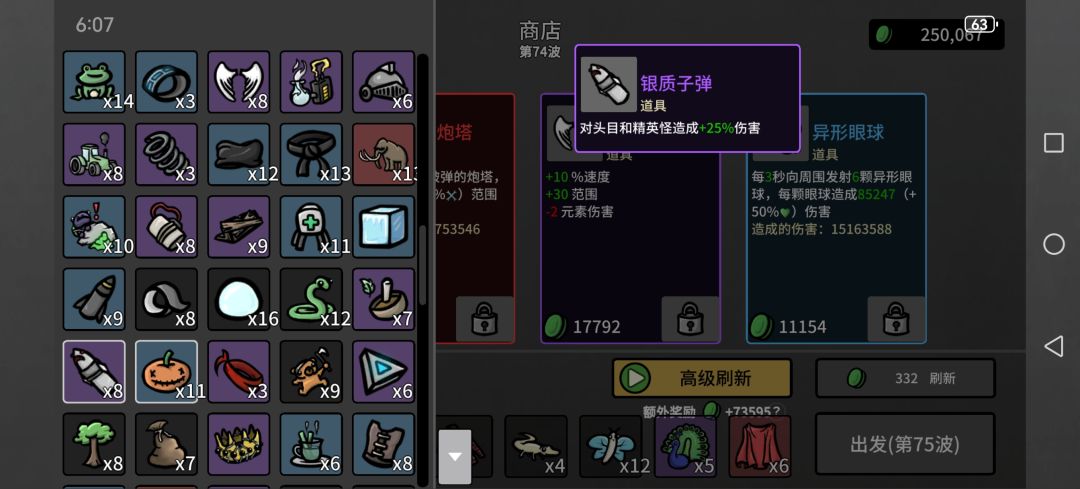 然后一些上限很离谱的,类似弹夹,每80材料加1最大生命值,看看广告材料就有了,血要多少有多少,反而护甲什么的叠不上去,可能还有未发现道具,已经无敌