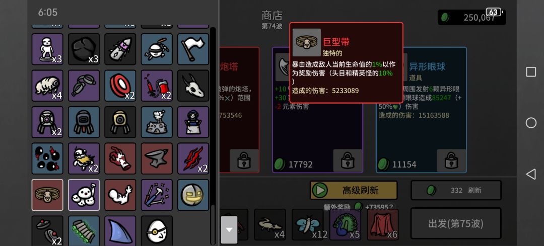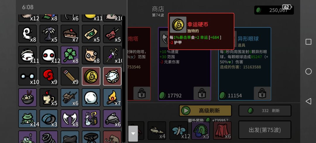 如图……其中武器我只推荐了唯一一把,建议所有职业都拿一把这个,减速100%之后怪就不动了,还有道具里面最重要的其实是硬币,击杀怪物后100%概率拾取掉落材料