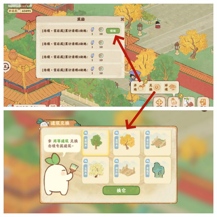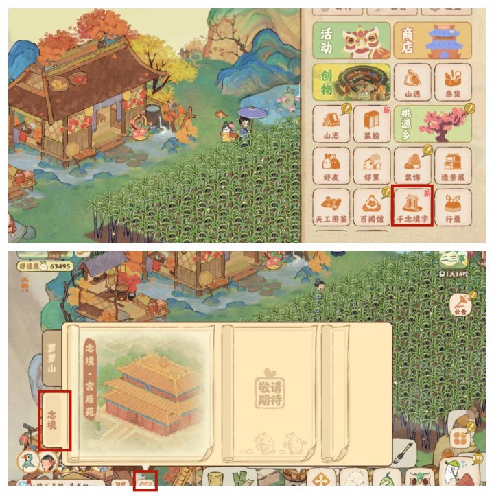 1.右下角新增念境宫后苑入口,也可以在左下角地图进入。2.新增开地奖励,一共10装扮卷轴,100玎珰。3.兑换建筑从三个增加到6个。4新增环境氛围,参与活动获得。