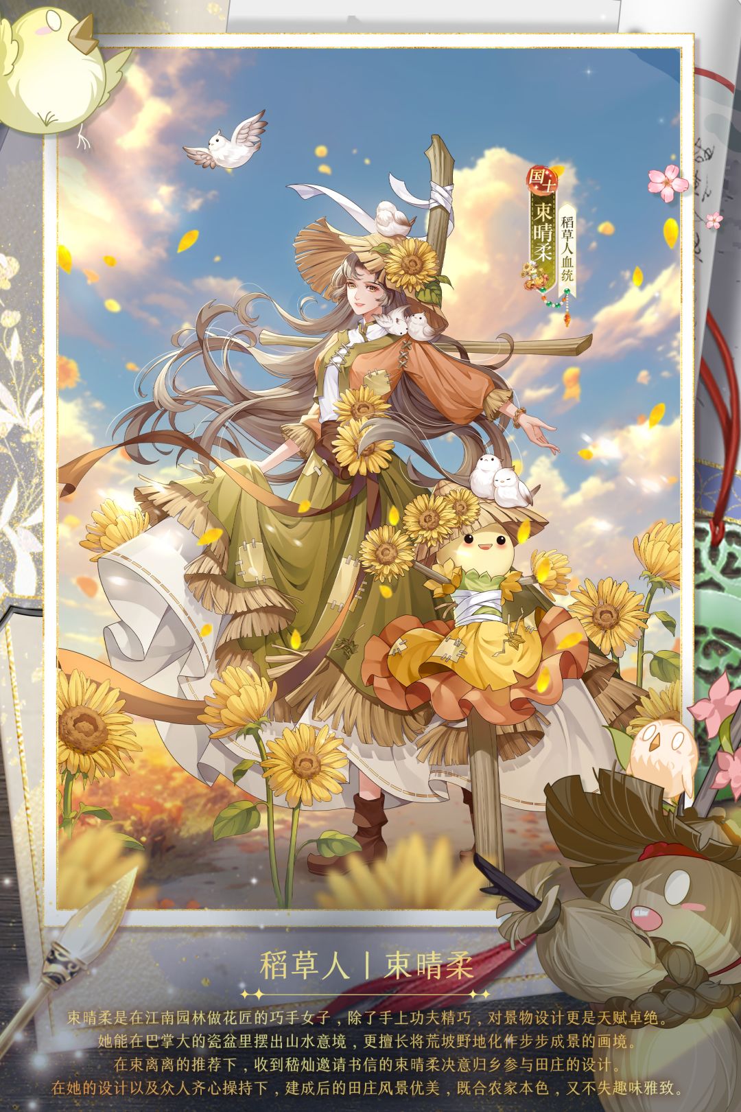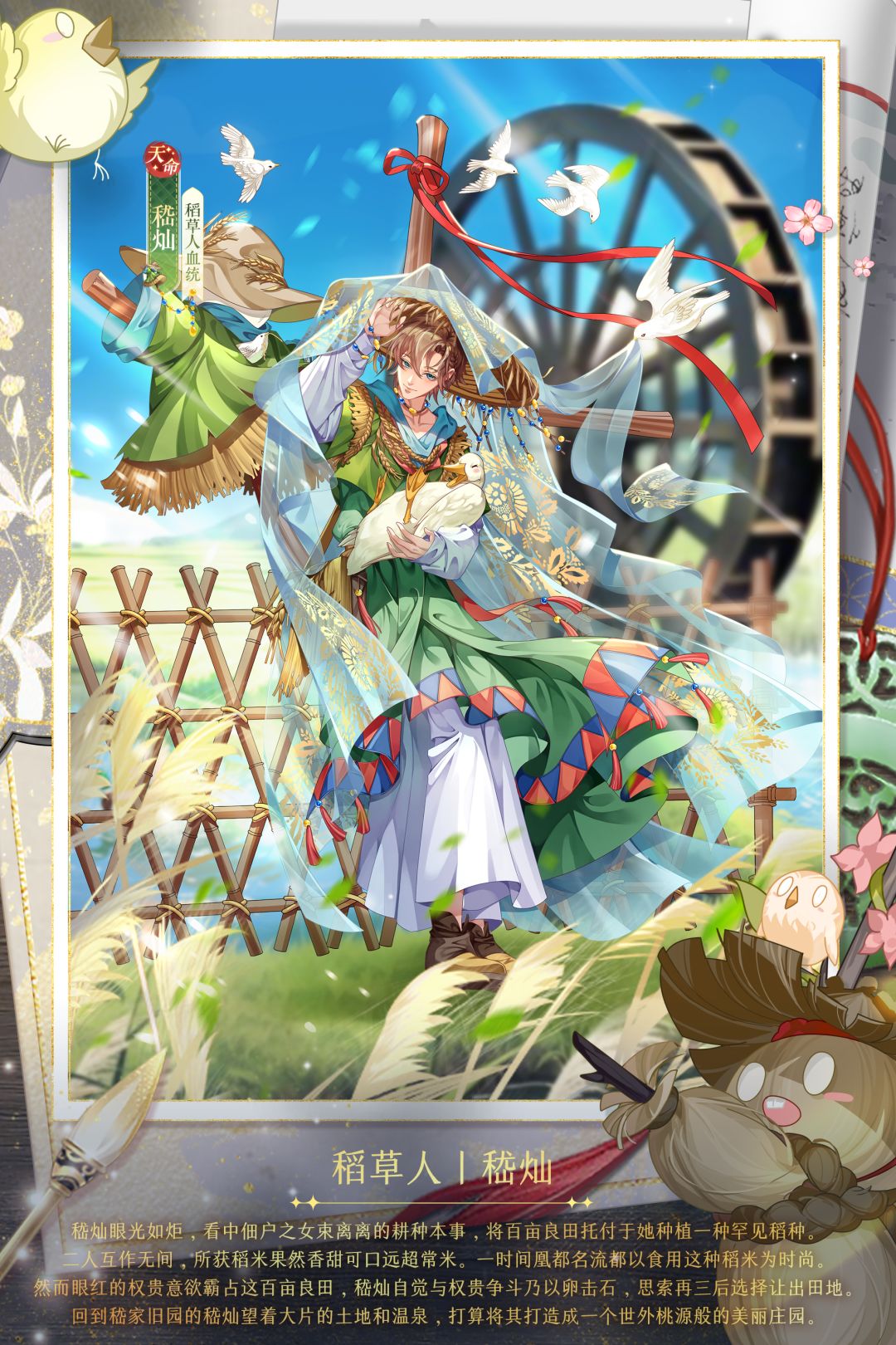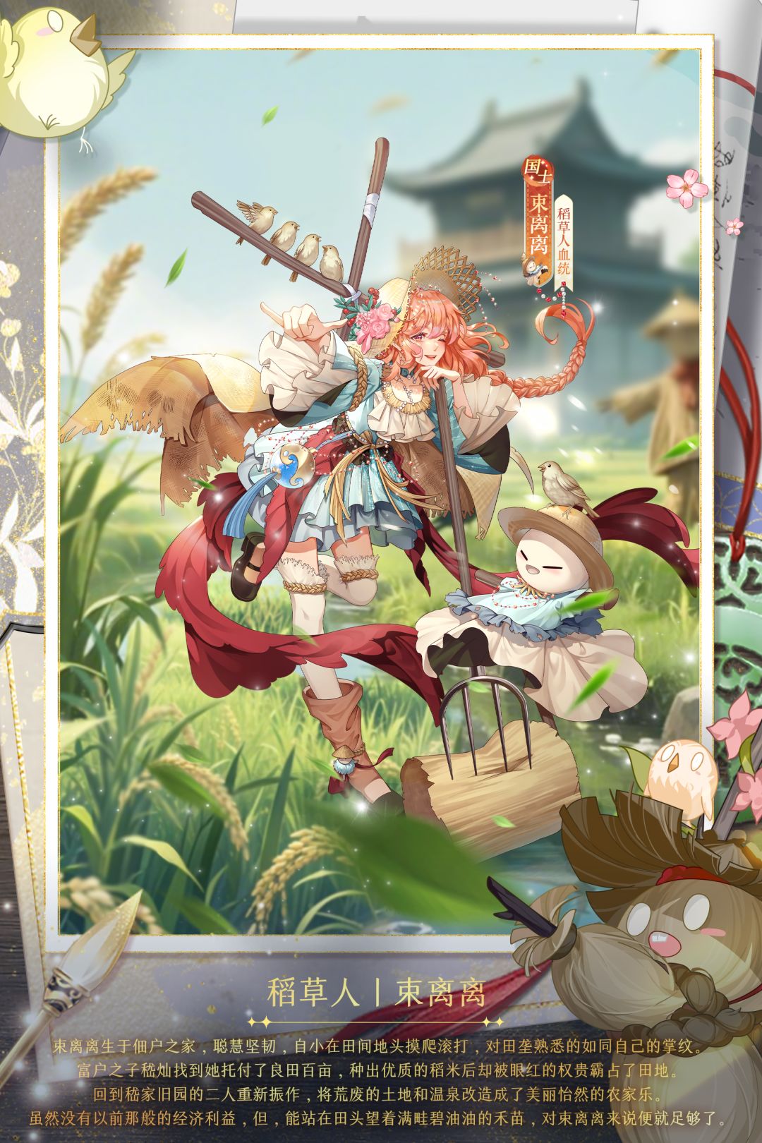 【种族技能】“晚照守田”:传召稻草人血统的侍臣时,有一定概率获得1个晴日草友或安心草友,可在【赏赐-宫廷宝具】中对侍臣或凰储进行赏赐,赏赐后可提高被关联侍从的属性;稻草人类型宝具在触发探望时,每天最多可获得神兽头饰灵能*50