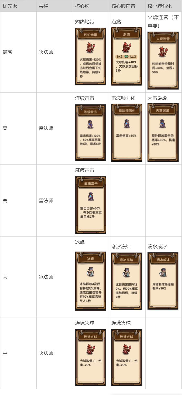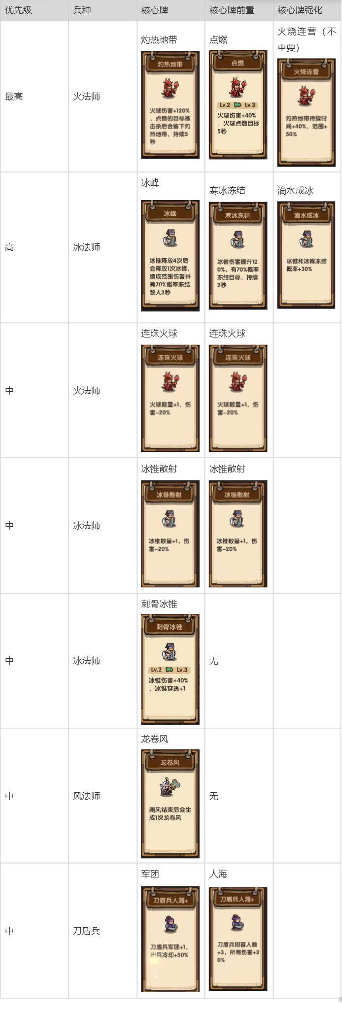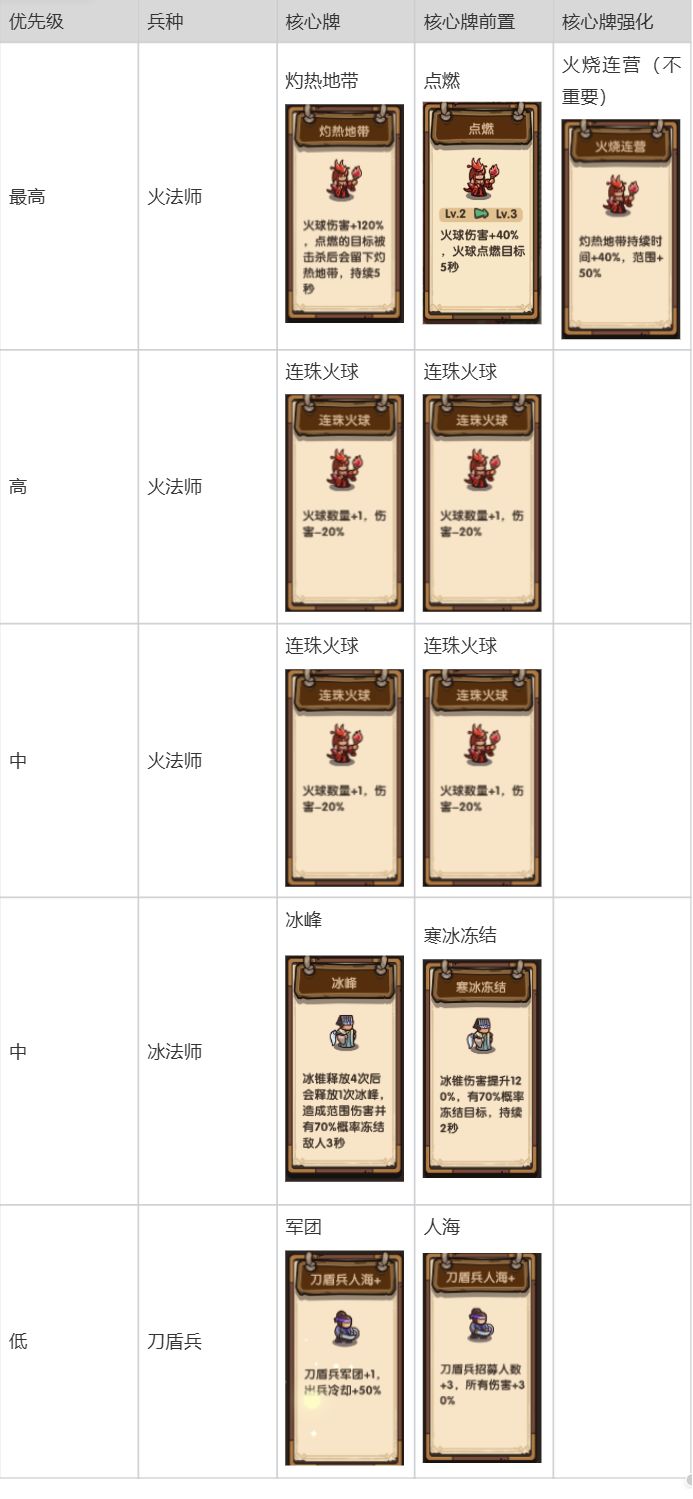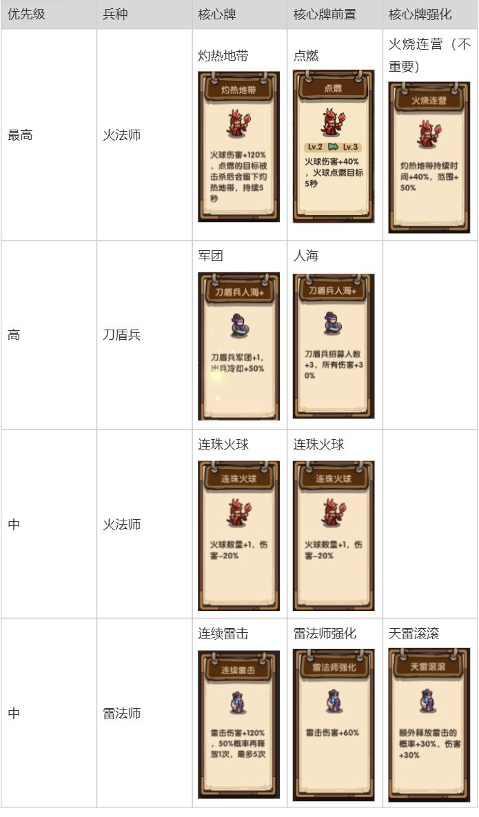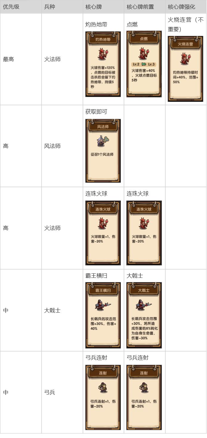 如果有了部分军师武将,则无需铺满兵种撑前期强度,直奔火法牌就可以。选不到火法就补前排,刀盾长枪任意前排都可以,撑点人口数量不用强化。